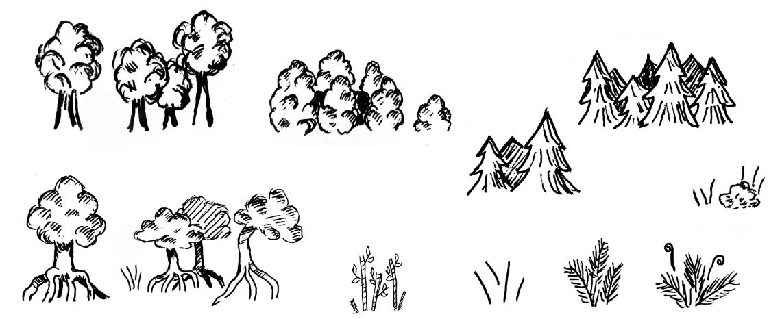 After completing the main map, I drew a series of geographic features for reuse across the entire expanse. “Simple, bold lines” became the rule, as more intricate sketches scaled down poorly, which I found especially (and sadly!) true for trees. At first, I was determined to differentiate tree types for added nuance (mangrove trees vs. evergreens vs. palm trees), but I learned my mistake when digitizing such assets. Frankly and despite my ambitions, a certain level of detail wasn’t visually friendly when applied to an entire, high-level world map. In the case of tree types (plus reeds, bamboo, and more), minor details interfered with the map’s primary purpose: communicating key locations.