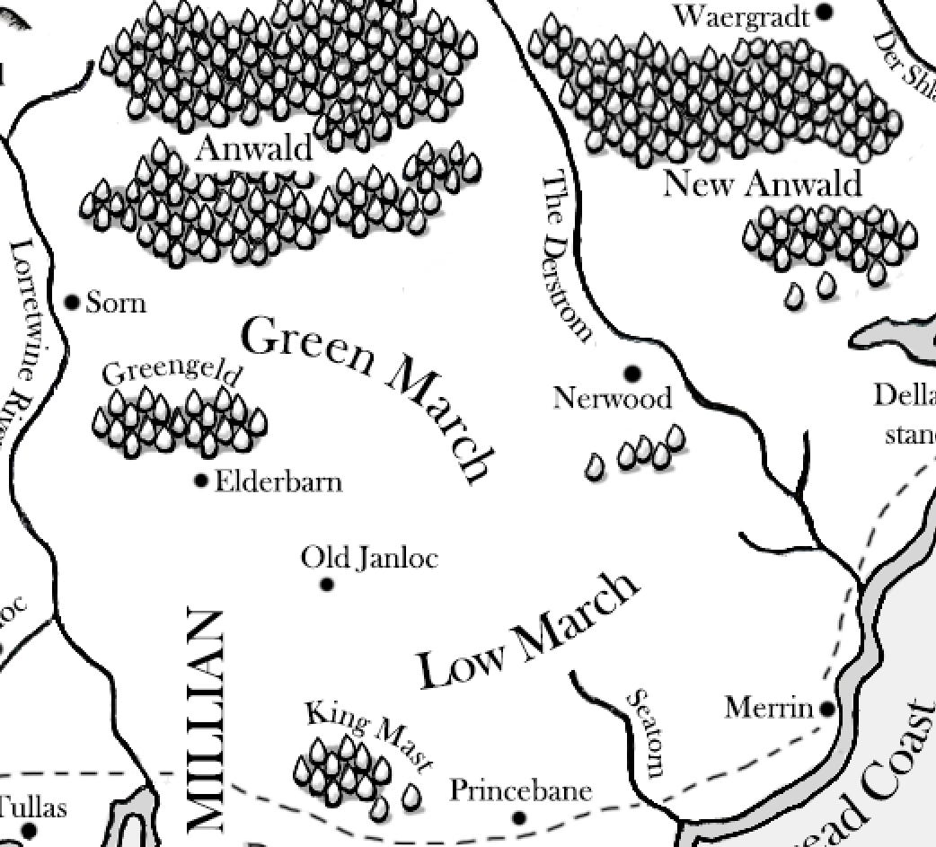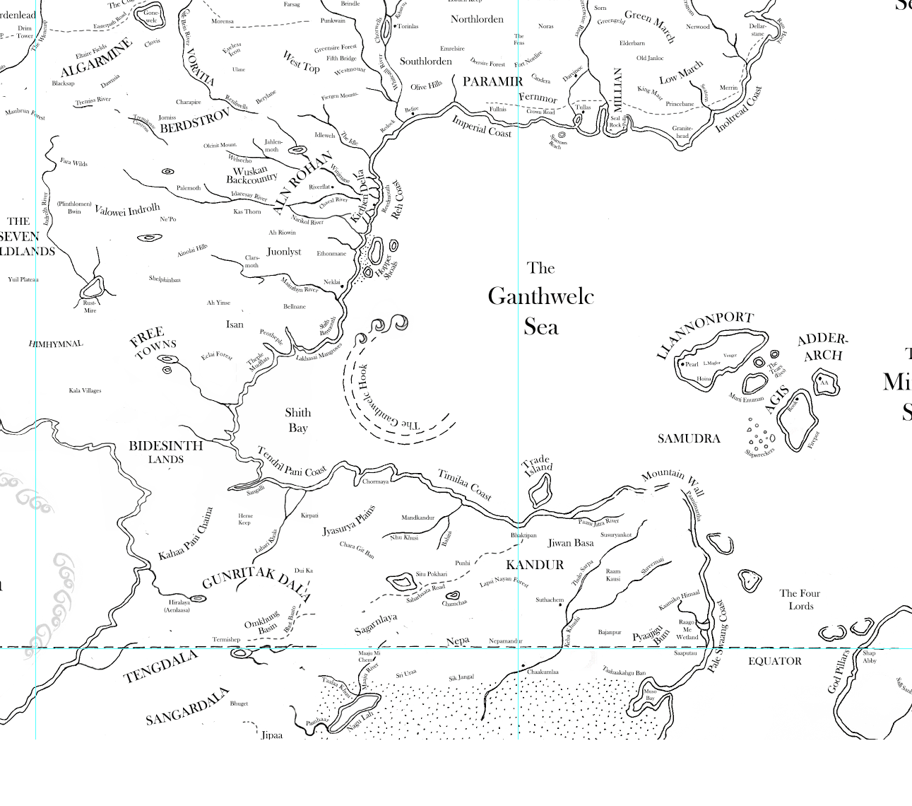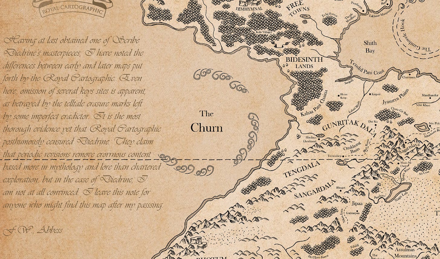 Based on visual balance, add idiosyncrasies that give your map character and extend world-building beyond geography. In my case, I added a merchant’s mark. I also added a scribbled note from a scribe who owned the map at some point. This kind of work is enjoyable, but also adds depth.