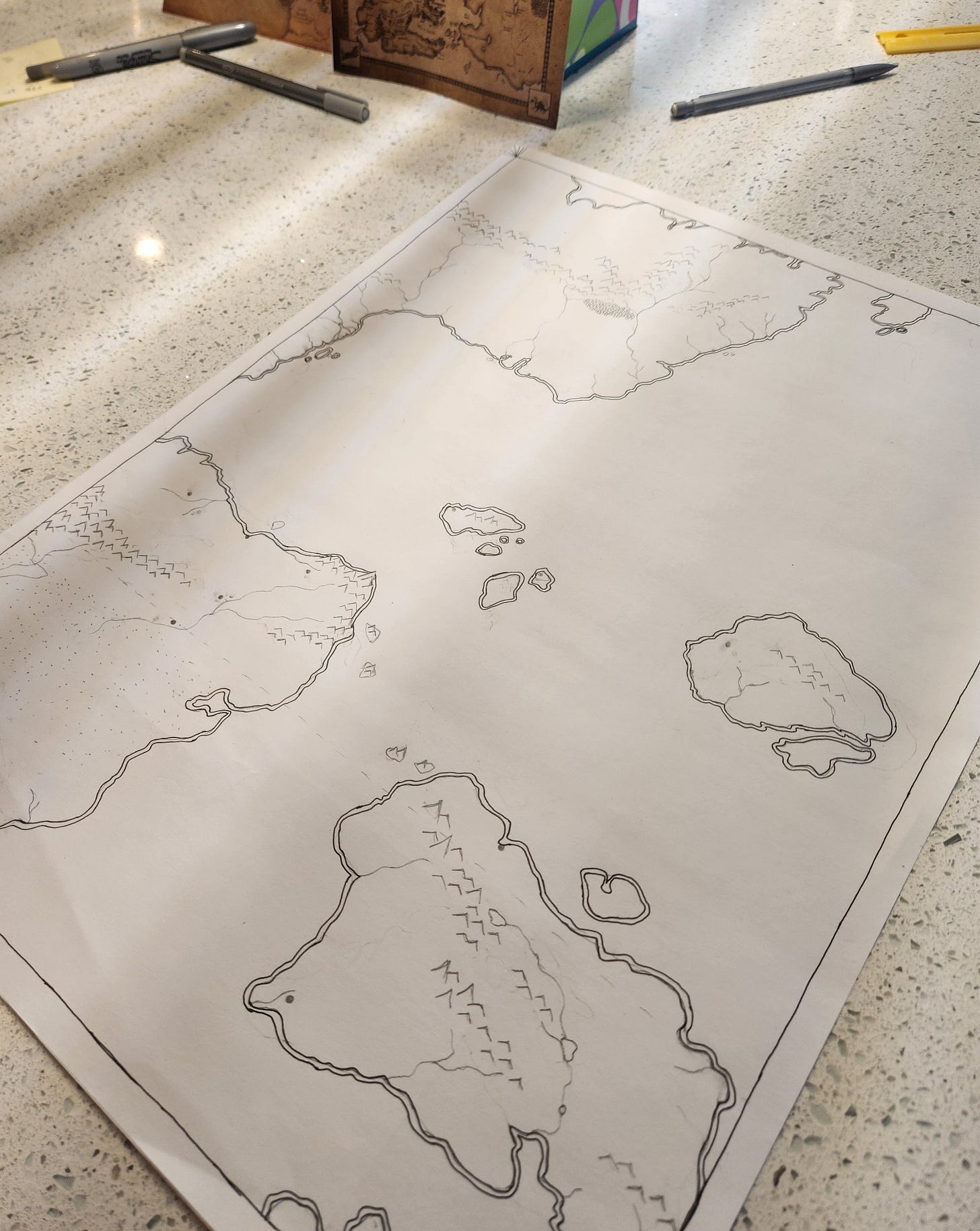 Add the final elements that you’d expect on a proper map: a compass rose, any pictorial flairs (ex. the classic sea monsters in unexplored waters), a border, or even latitude and longitude. Once those are present, you can assess the overall visual balance of the map and decide whether additional elements would complement the core.